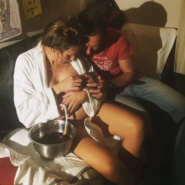 The rest was a sweet love haze I don’t fully remember. I stayed in the pool while baby found the breast. I remember drinking some gorgeously sweet cinnamon tea, Nicola had made, and one of Gloria Le May’s recipes for helping to birth the placenta. I told everyone to have a chocolate Id made to help with birthing the placenta and lay my head back listening to the happy soft chatter of everyone. There were no sensations to suggest the placenta was coming but I knew it would. I eventually got out of the pool with baby and lay on the couch as the 2nd midwife arrived. I later sat on the toilet with a bowl to catch the placenta which I could feel moving as I squatted. It then came out and I rested back on the sofa with my beautiful buddha boy and Robin. I don’t know how long we stayed like that letting it all sink in. I looked at the placenta and traced the cord back to the baby’s tummy and marvelled at this otherworldy organ, a soulful entity uniting two beings - mind-blowing.