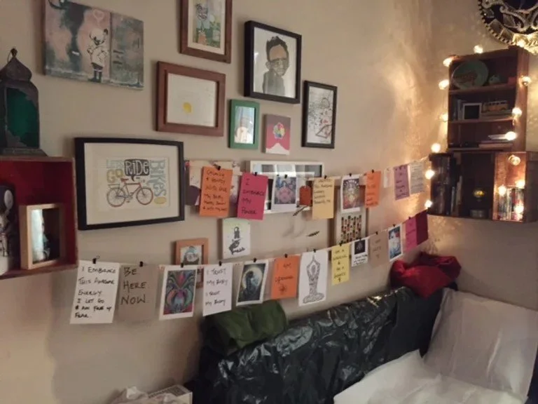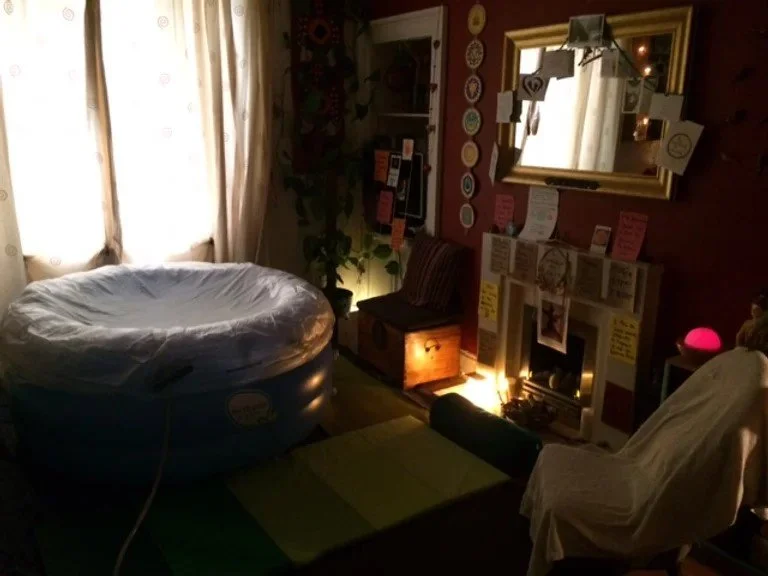 We had a morning of doing, Robin dropped leo at nursery and did the practical shit, chucking stuff into the attic, setting up the pool, an essentials trip to the shop. I had a quick nesting session, cleaning and tidying and getting a small collection of essentials for me - birth face spritz, birth oils, face towels, rescue Remedy, lip balm, bobbles, head torch. I then set about preparing the birth cave while taking little rests to do some yoga or talk to baby. I made the space dark, sorted lightening, padded the floor with mats and towels and hung my birth affirmations up around the pool and the wee shrine I had made a week before. As I hung the affirmations I repeated them to myself and baby trying to breath and seal them in.